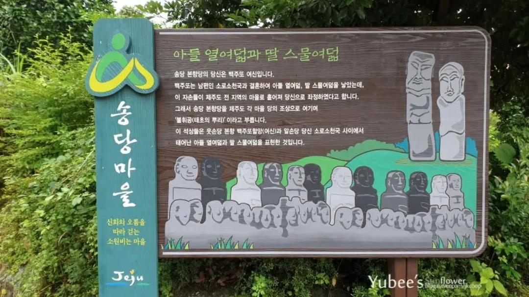 게시판의 내용을 정리하면 이곳 송당 마을에는 '백주또'라는 어머니 신이 있었고 남편인 '소로소로천국'사이에 열여덟 명의 아들과 스물여덟 명의 딸이 있었습니다.