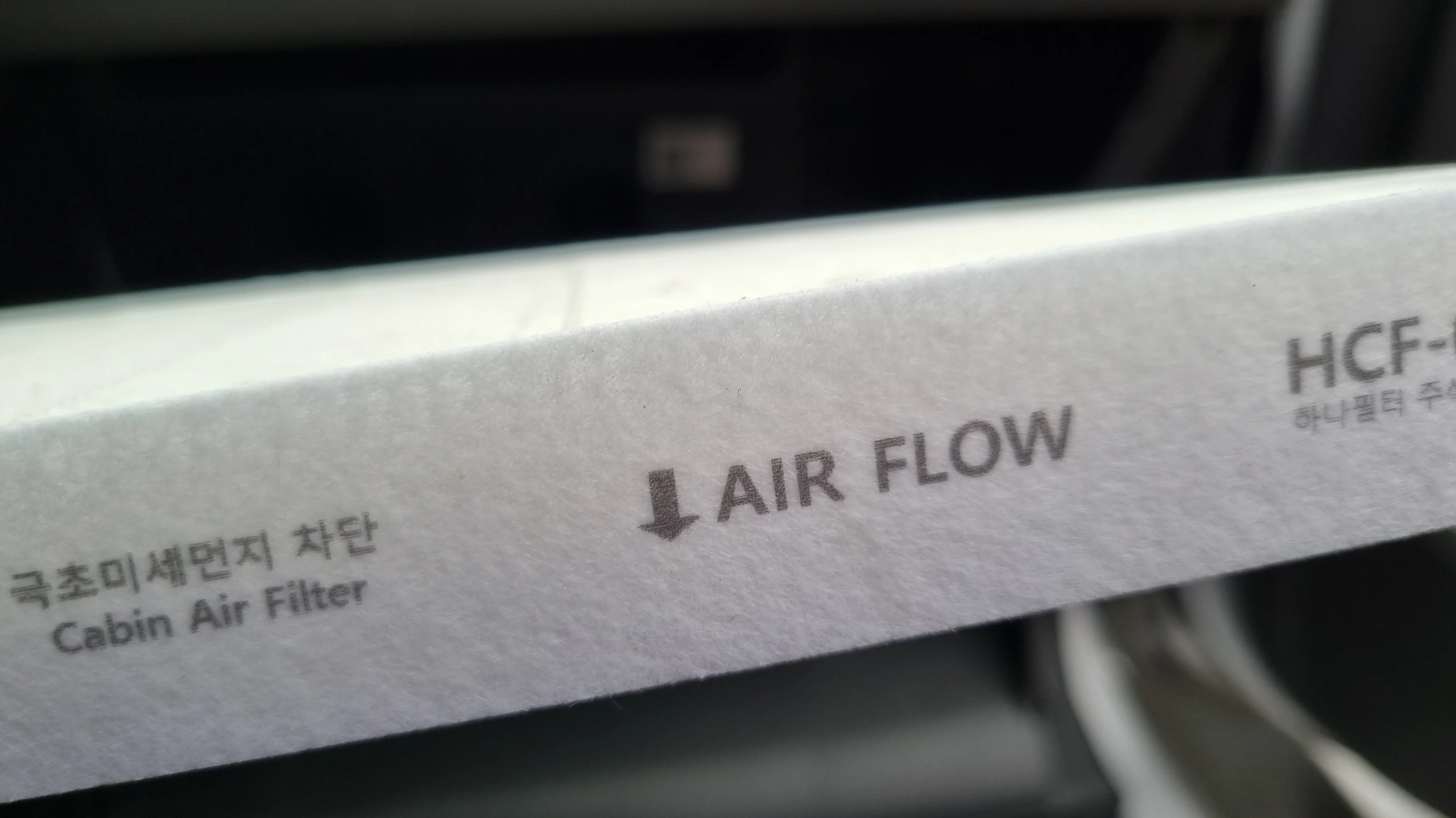 아반떼 HD, 아반떼 AD 에어컨필터 끼우는 방향은 필터 옆면에 표시된 AIR FLOW 화살표가 위에서 아래로 지면을 향하도록 맞춘 상태에서 끼우면 됩니다.