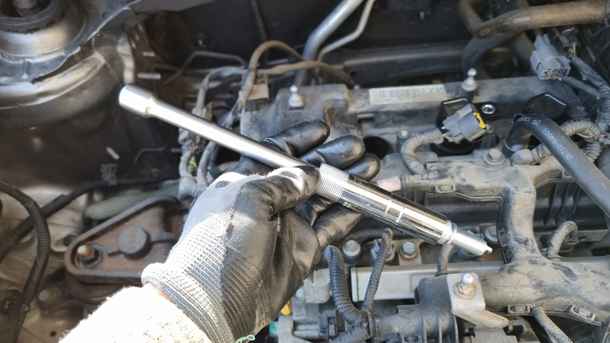 점화플러그는 엔진 위쪽 깊숙한 위치에 끼워져 있어서 점화플러그를 완전히 풀더라도 손을 빼낼 수가 없습니다.