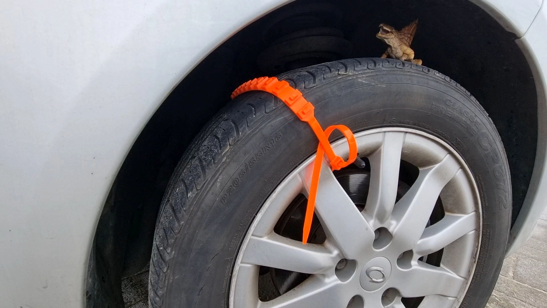주행 시작 후 300미터도 못 가서 9개의 케이블타이 스노우체인 중에서 6개가 끊어졌습니다.
